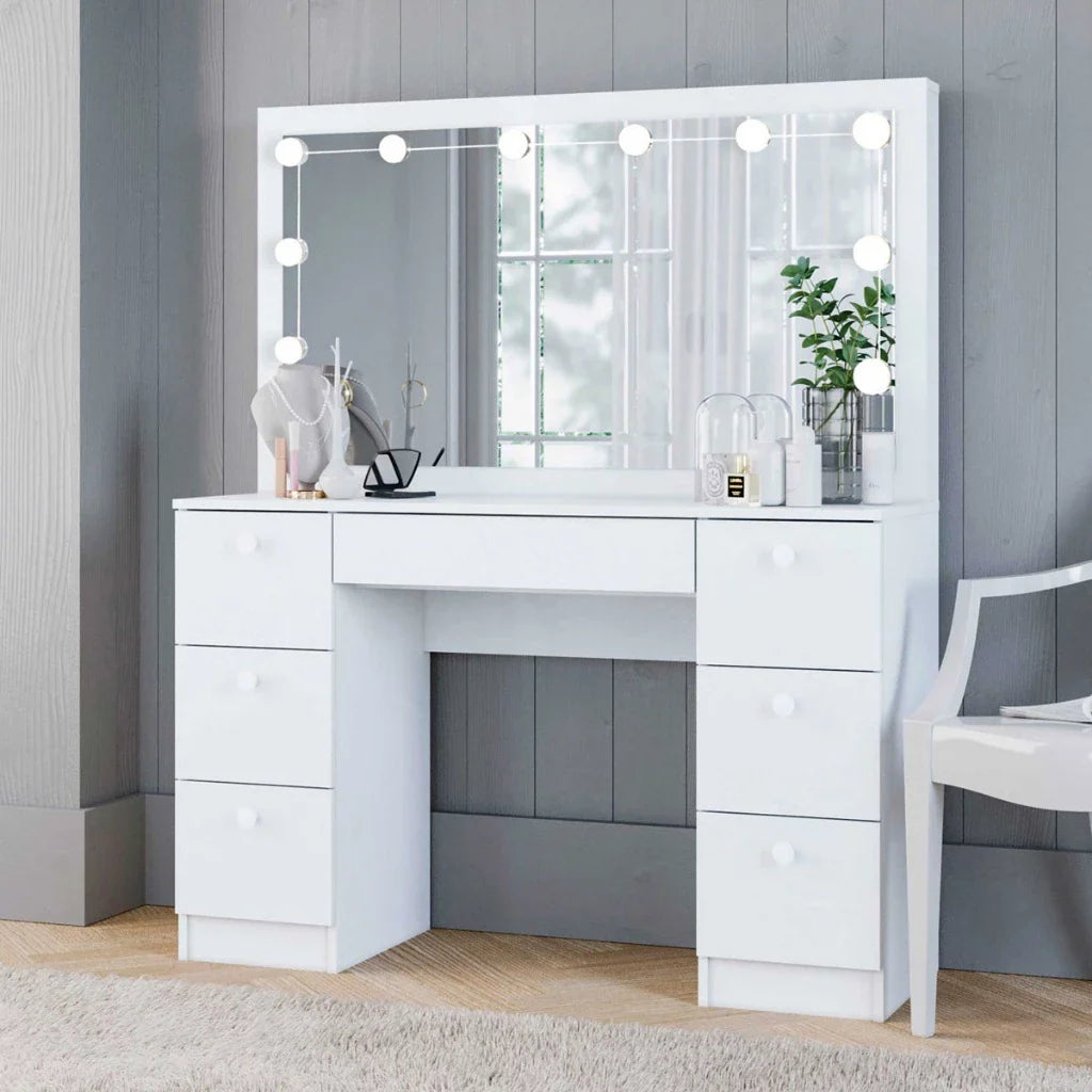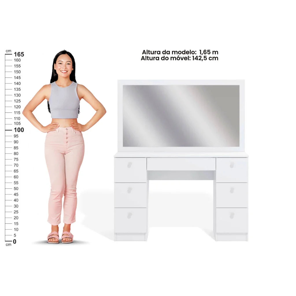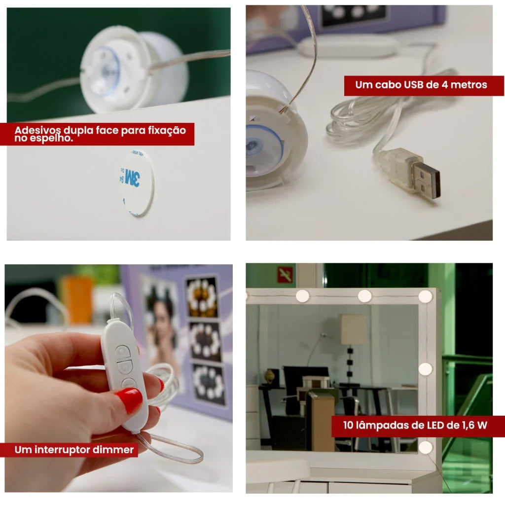 Diferente das penteadeiras comuns, este modelo oferece Máxima Capacidade de Organização e um sistema de iluminação que garante a maquiagem perfeita, sem sombras indesejadas.